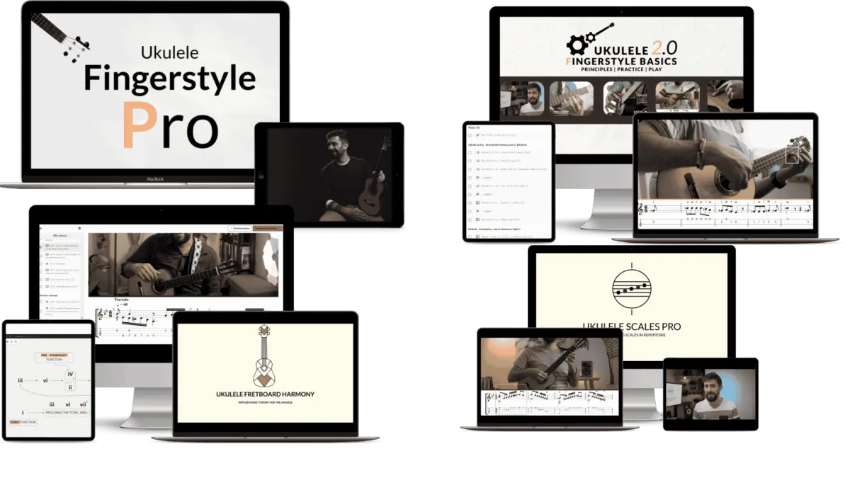 4-MEGA Course Bundle: Ukulele Fingerstyle Basics ($197), Ukulele Fingerstyle Pro ($897), Ukulele Fretboard Harmony ($197), Ukulele Scales Pro ($127)